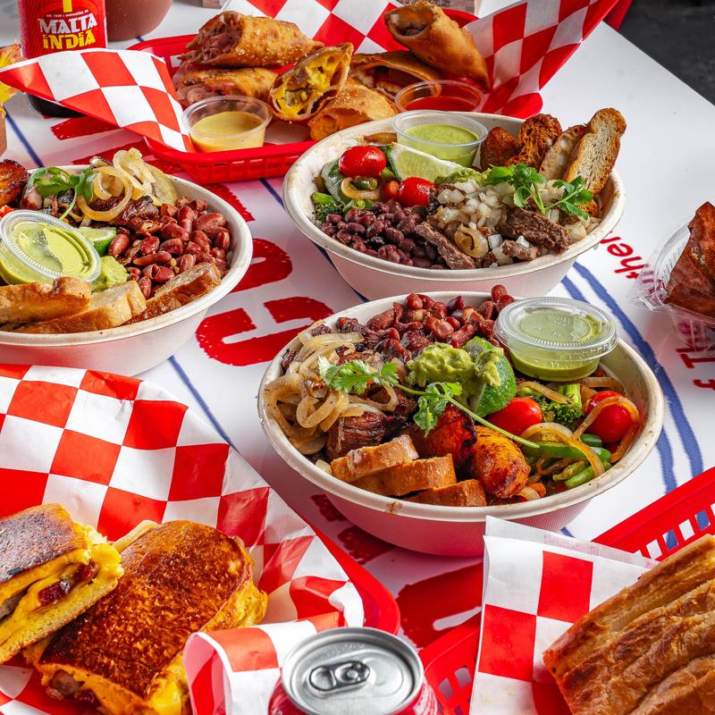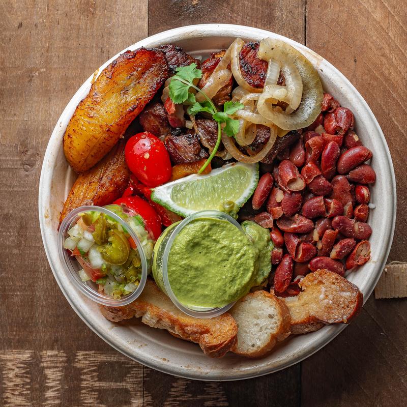 Pair our wonderful red bean and rice bowl with one of our four house proteins (lechon, pate de pate, chicken, or picadillo). Our bowls are served with 3 pieces of garlic toast made from Cuban bread and 3 sweet plantains.