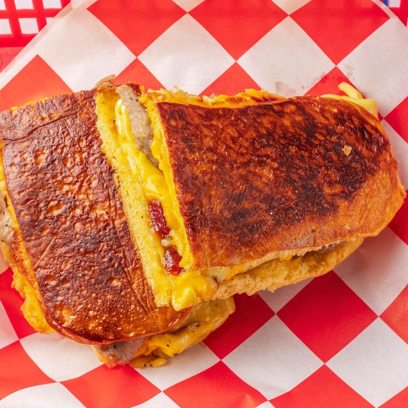 Sausage, egg, & cheese with a strip of guava in the middle of the fluffy omelet pressed on our Media Noche bread (sweet bun).