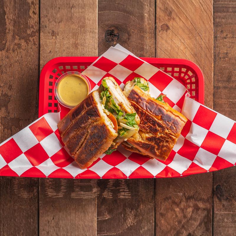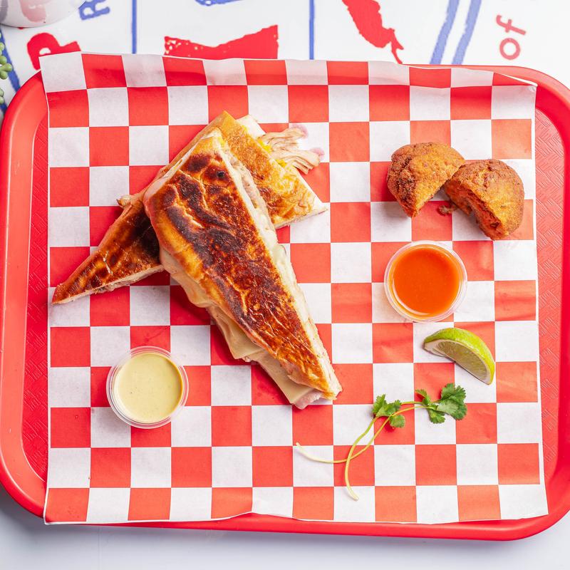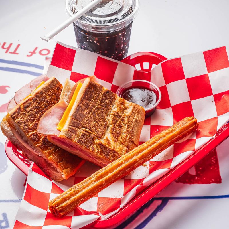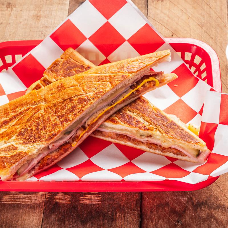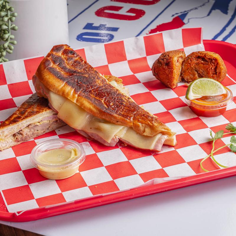 This mouthwatering sandwich is a must-have. Buttery toasted Cuban bread stacked with crispy ham croquettes (croqutas de jamon), Swiss cheese, pickles, serrano ham, and mustard.