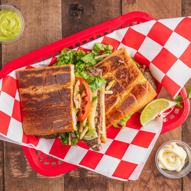 A top seller of the Box of Cubans. Our Palomilla steak is marinated in mojo, Swiss cheese, sauteed onions, fresh lettuce, tomatoes, crispy potato steaks, house cilantro sauce, and mayo.