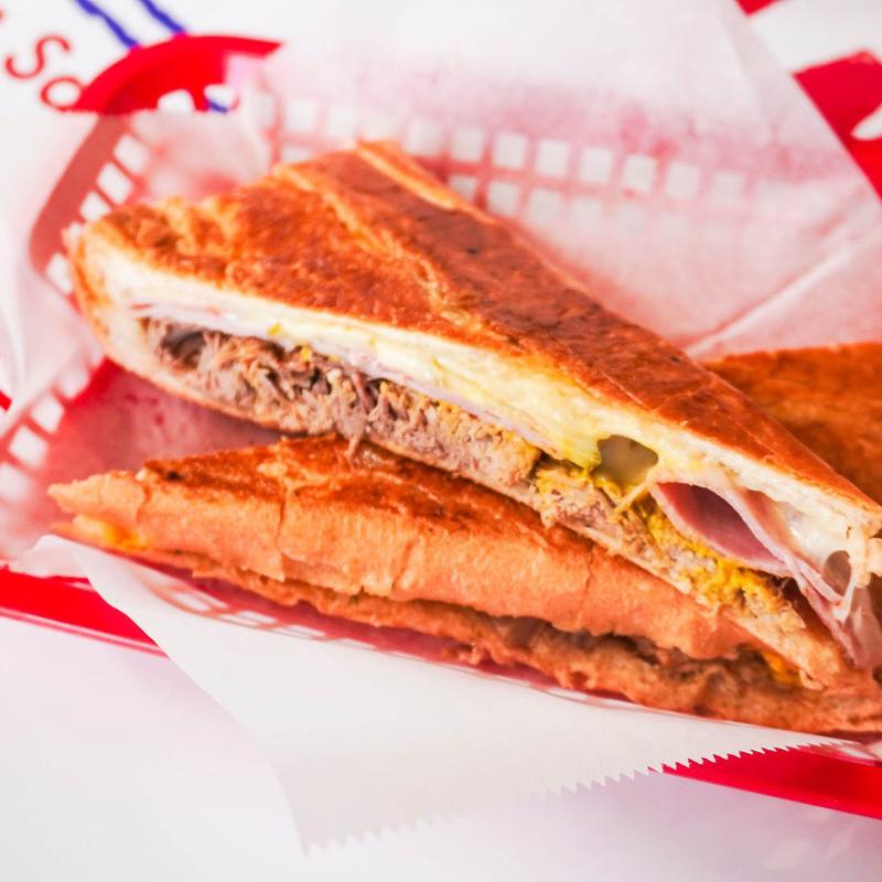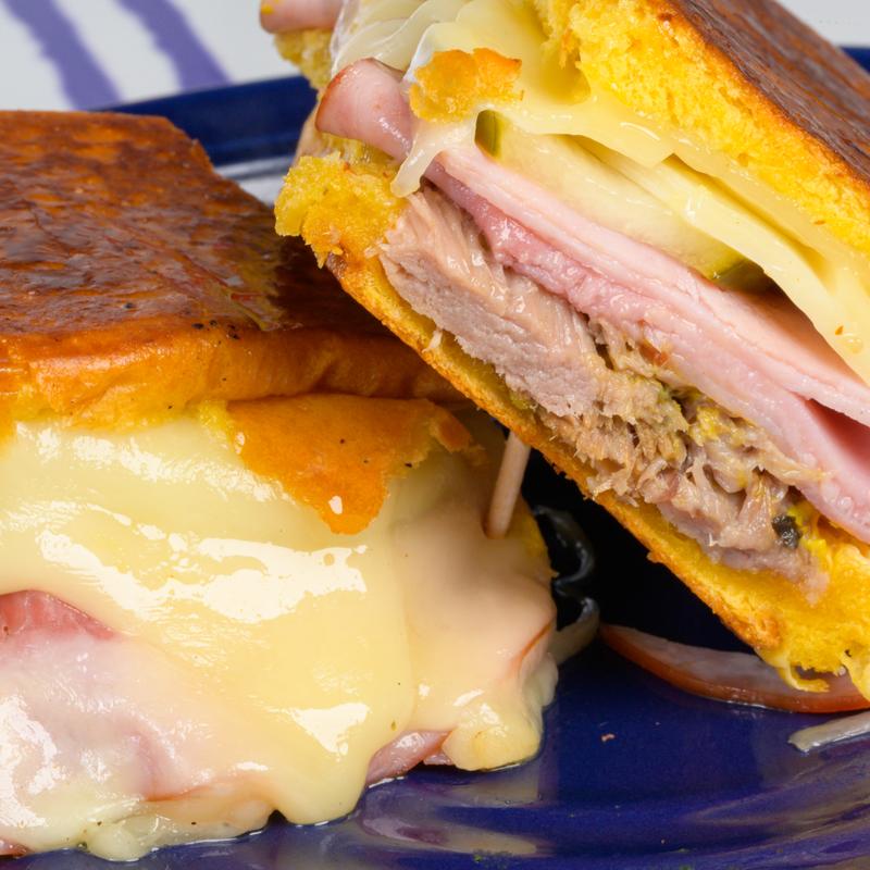 The Classic Cuban Sandwich - Tender, juicy pork (Lechon) in specialty house spices marinated over 24 hours, serrano ham, Swiss cheese, pickles, and mustard, then pressed on Cuban bread.